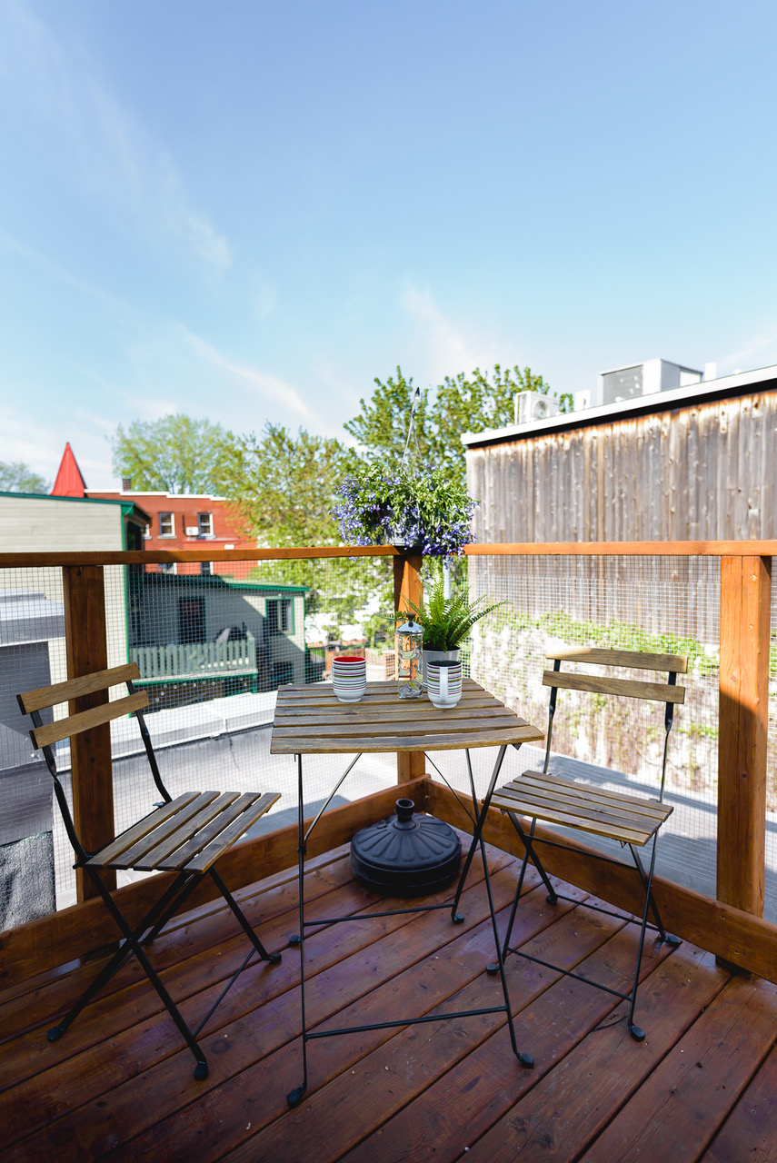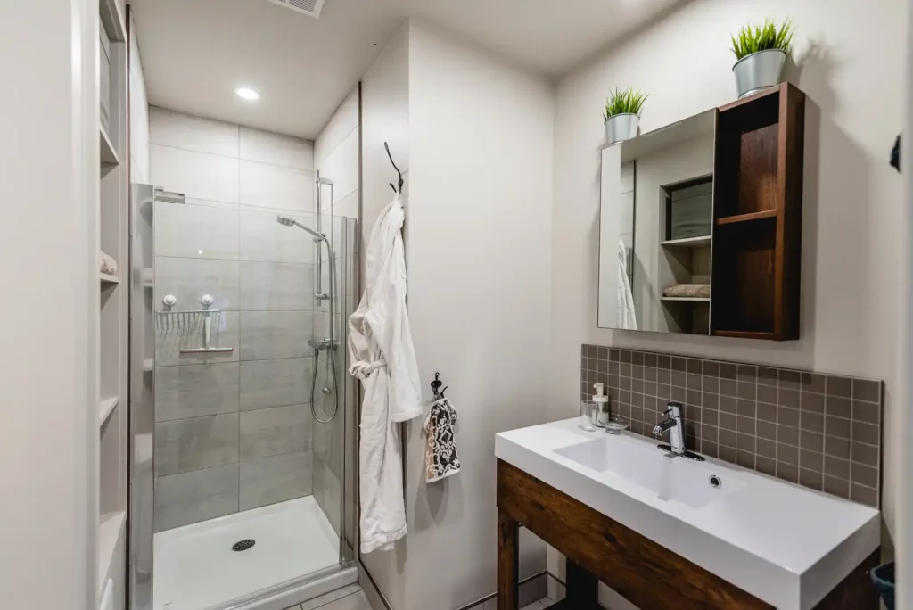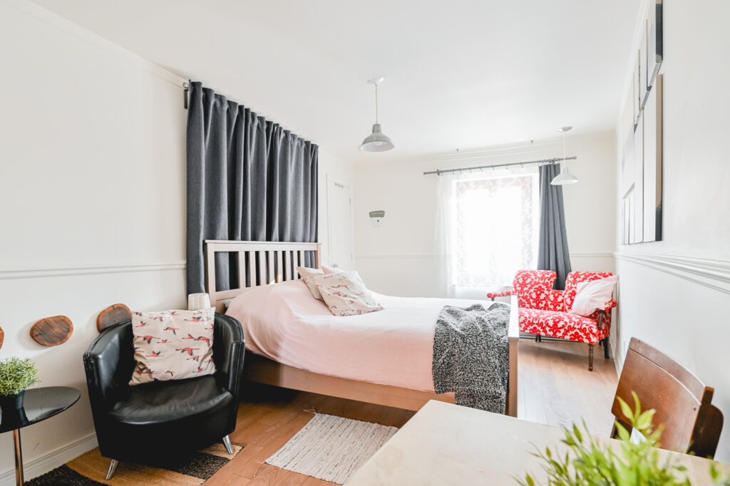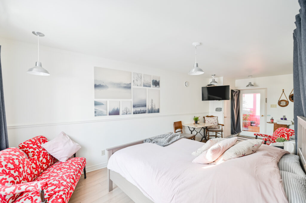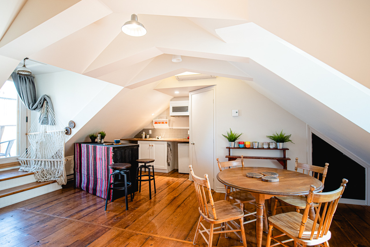 Vous profitez d’un grand espace style loft (avec 2 lits simples), un coin chambre (avec lit Queen), une salle de bain indépendante, une cuisinette et une terrasse sur toit.