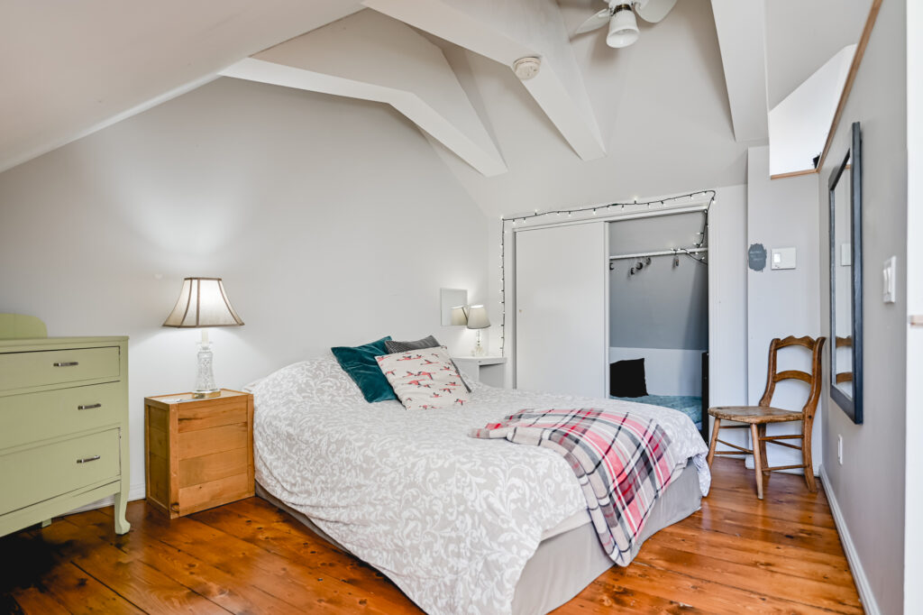 Vous profitez d’une chambre avec un lit Queen et sa petite causeuse. Vous avez votre propre salle de bain et l’accès à une cuisine, buanderie et une terrasse communes.